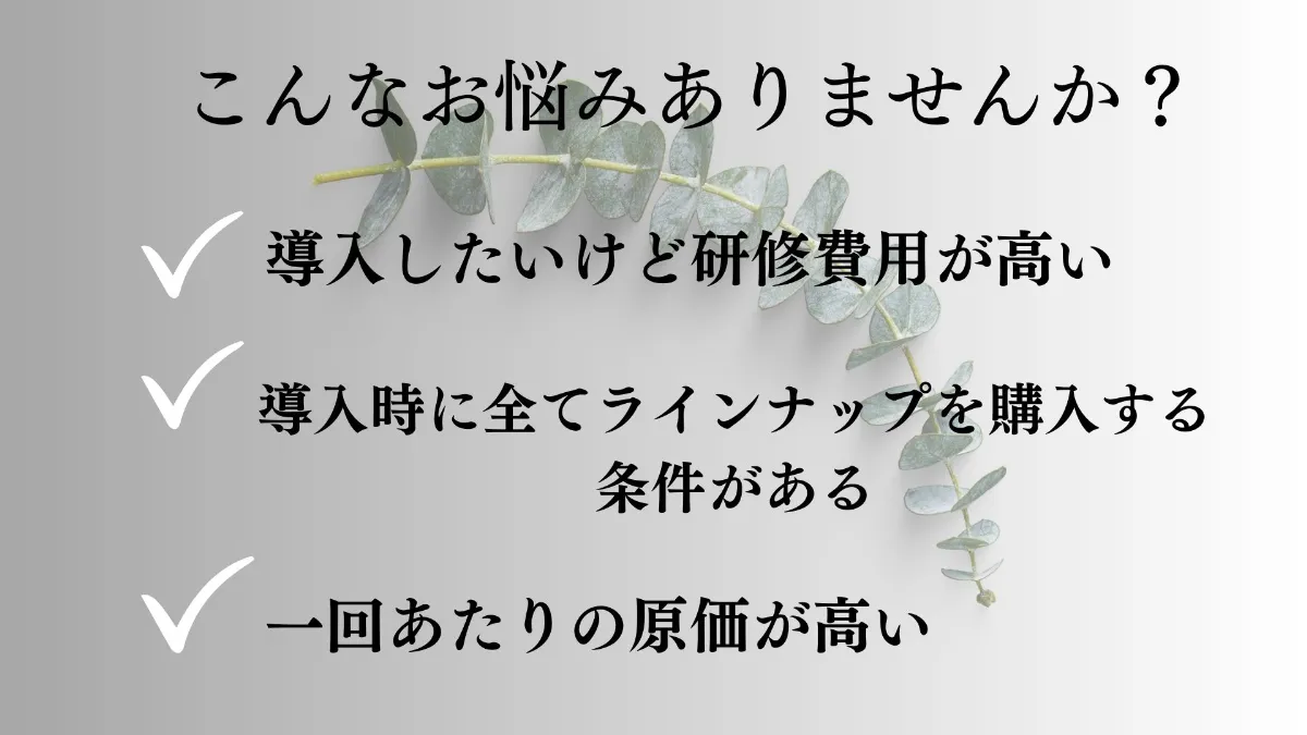 製品はそこまで高くないけど導入研修費用が高い 他の商品も購入しないといけない 導入するの迷ってしまいますよねそこで弊社は導入研修15,000円商品はセット2アイテムで35,000円で20回分と大変導入しやすくなっております。